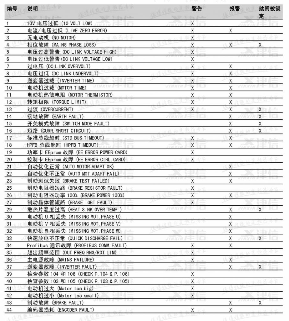 以下是丹佛斯VLT5000變頻器的故障代碼表: