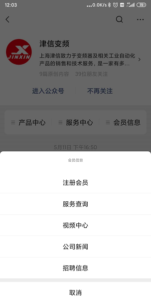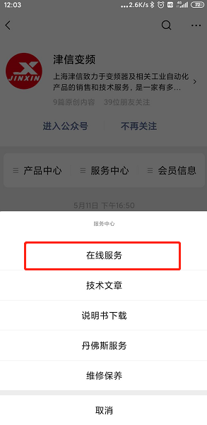 第一步,掃描二維碼,關注上海津信微信公眾號,公眾號包括產品中心,服務中心和會員信息三個主菜單。